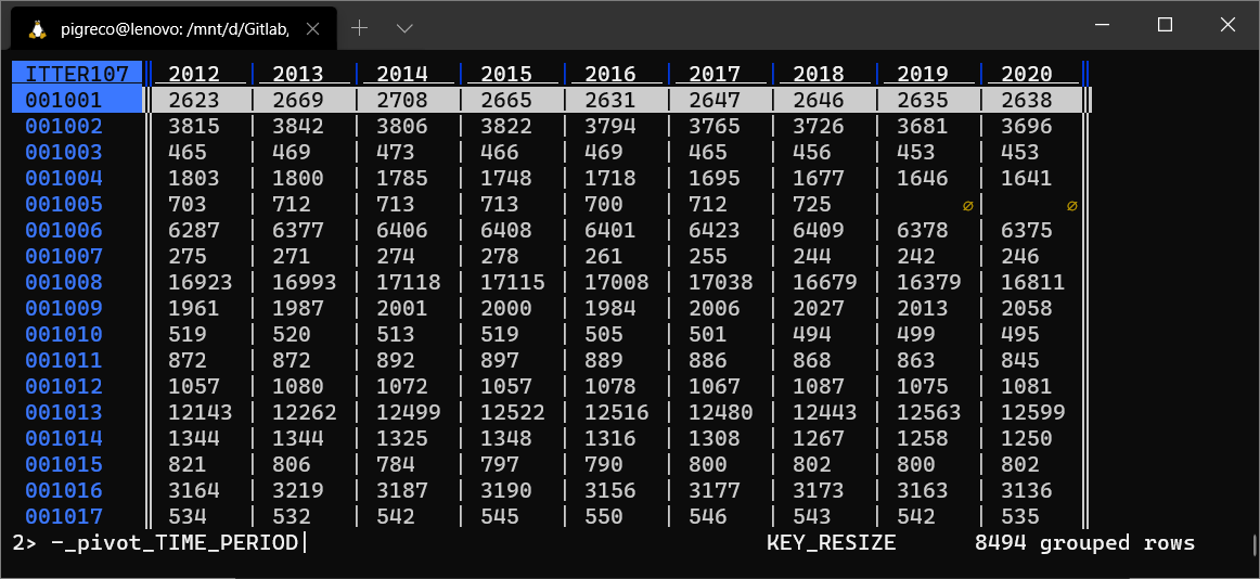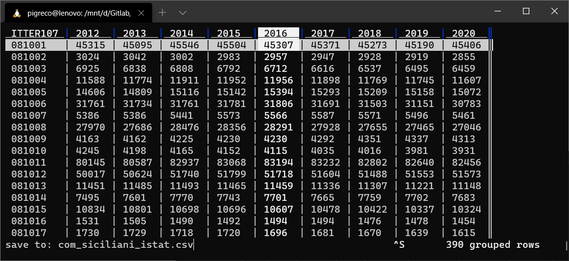 Per ottenere solo i Comuni siciliani (sono 390) occorre selezionare le righe relative e cancellare le restanti righe. In VisiData: